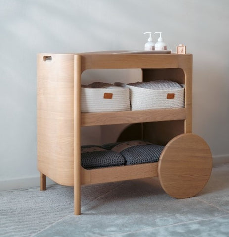 Crafted with thoughtful details, this changing cart can efficiently organise the array of items involved in new parents’ journeys, as it becomes a one-stop storage system. It offers ample space to keep baby's clothes, diapers, and other necessities within easy reach. Hence, the dedicated sections built into the top of the cart ensure that parents have everything on hand in one clear view.