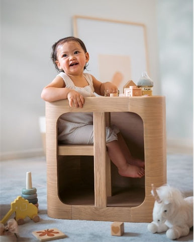 Multifunctional, the stool can be flipped from a comfortable seat in the household onto its side as a secure space for the toddler to sit in, keeping the little one safe while mums attend to other tasks. Its square-round shape inspired by the Hegen Sqround™ feeding bottles features soft curves that keep the toddler safe from sharp edges. With another flip, the stool is transformed into a tabletop, the perfect surface for the little one’s independent mealtimes or playtime.