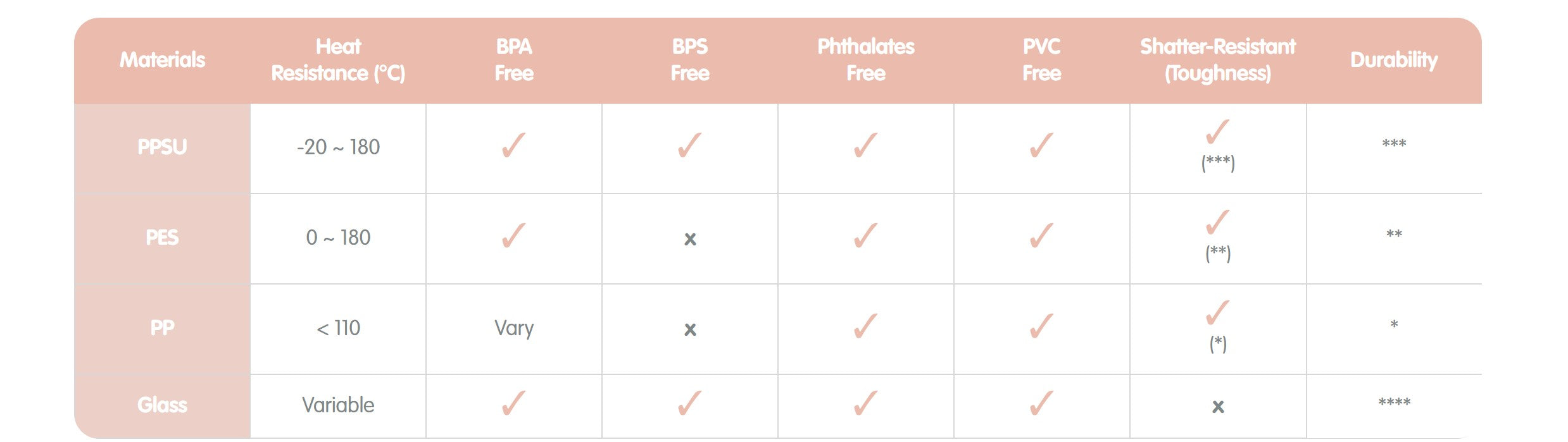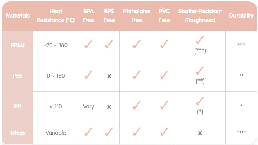 The Hegen Polyphenylsulfone (PPSU) range is made of FDA compliant food-contact grade material. PPSU is widely used in the manufacturing of medical appliances due to its superior toughness and high temperature resistance. It combines the advantages of both glass and plastic materials; BPA free and lightweight. PPSU is naturally amber-coloured and contains no artificial pigments. Hegen PPSU is free of BPA, BPS, Phthalates and PVC.